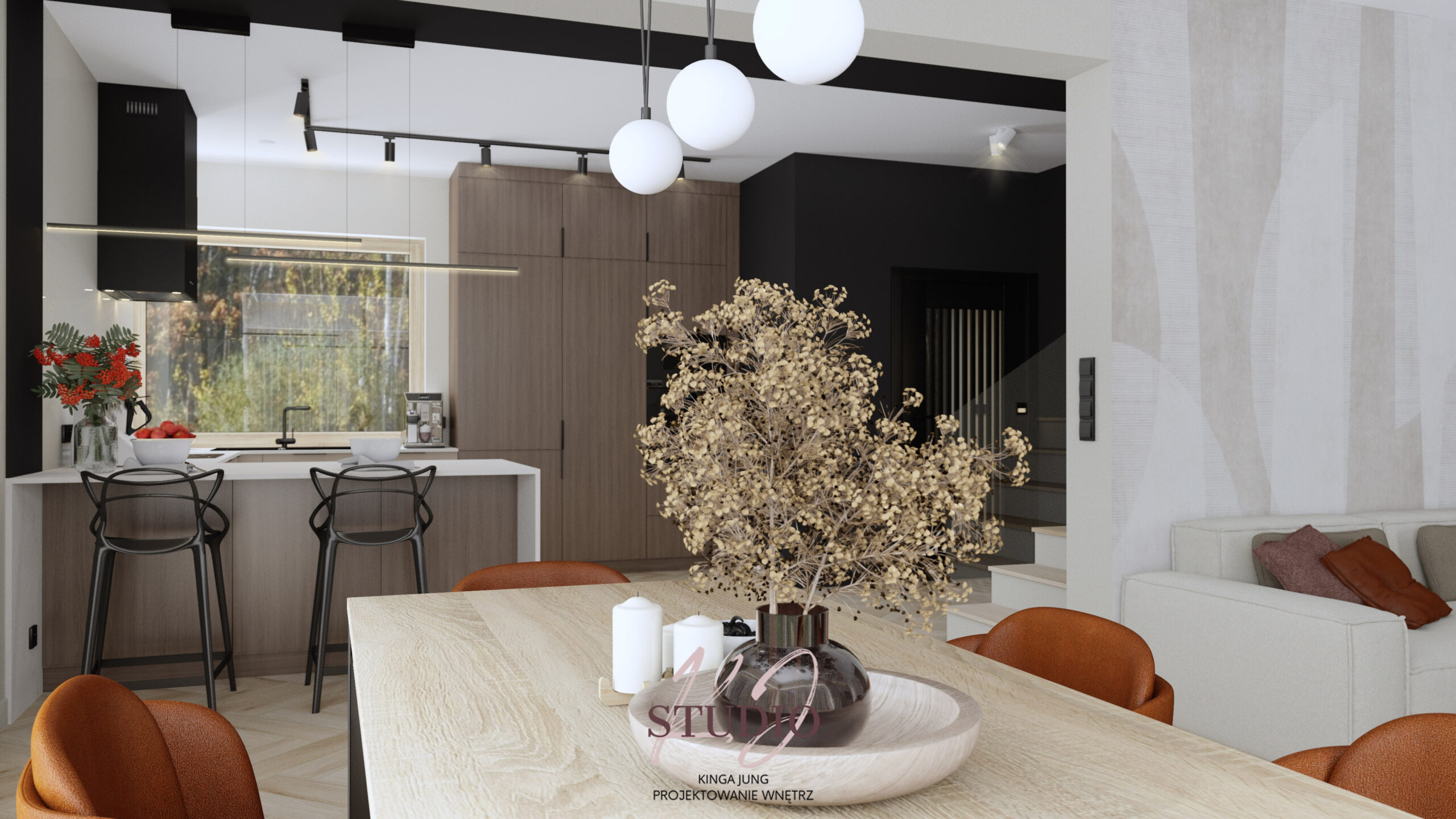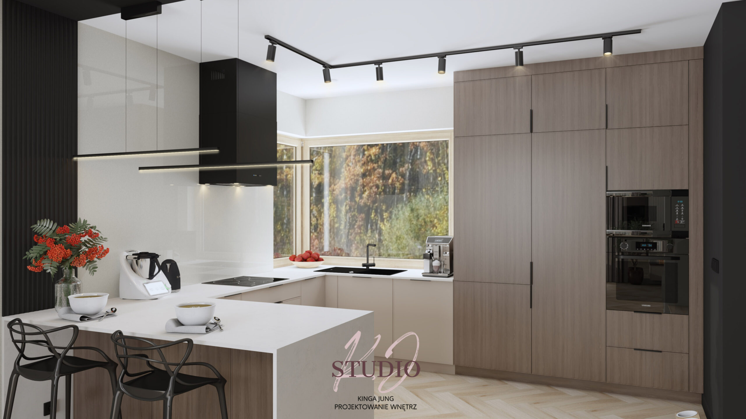 z drewnianym akcentem. Charakteru dodają tu czarne elementy jak okap, czy oświetlenie szynowe.