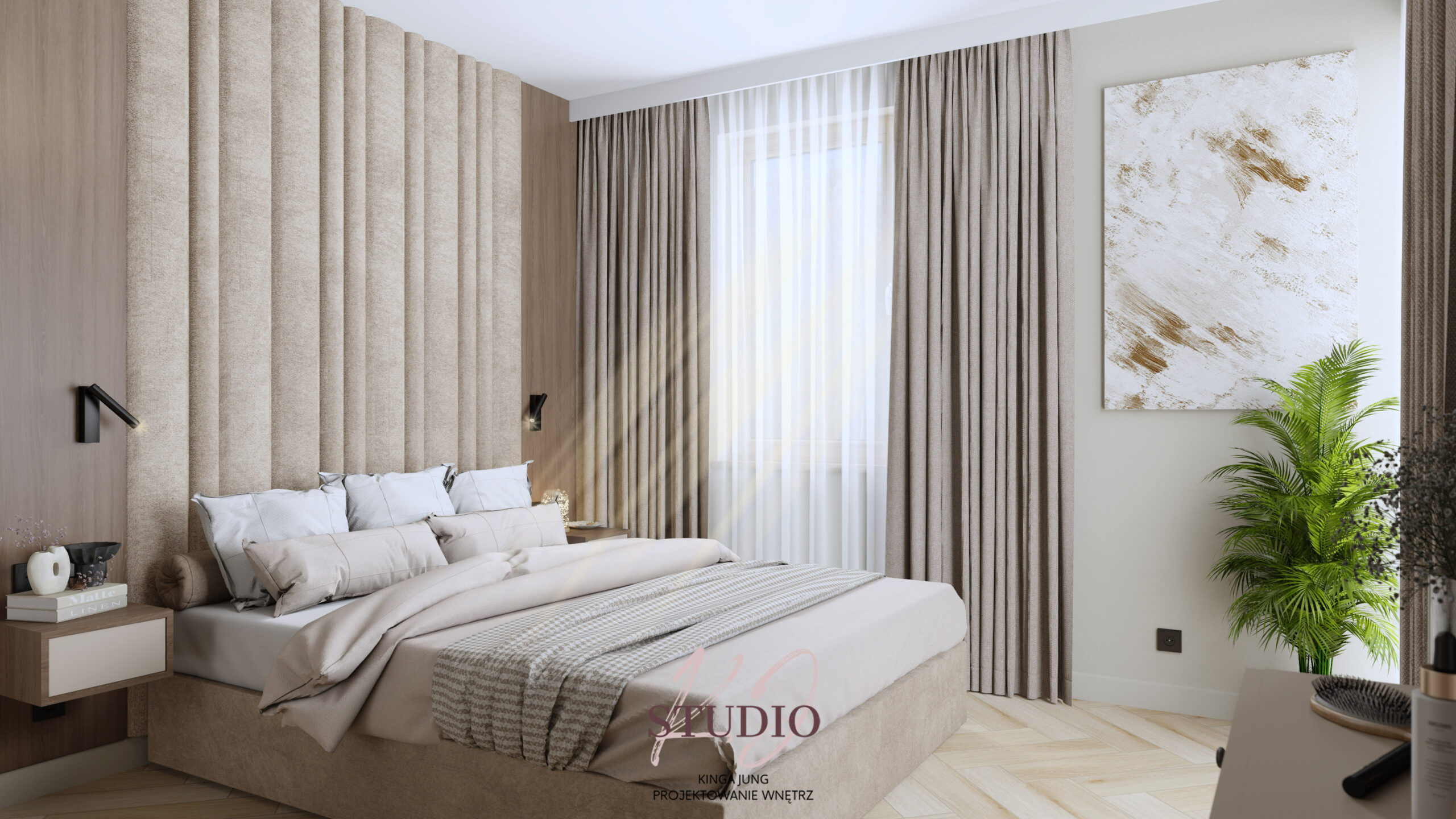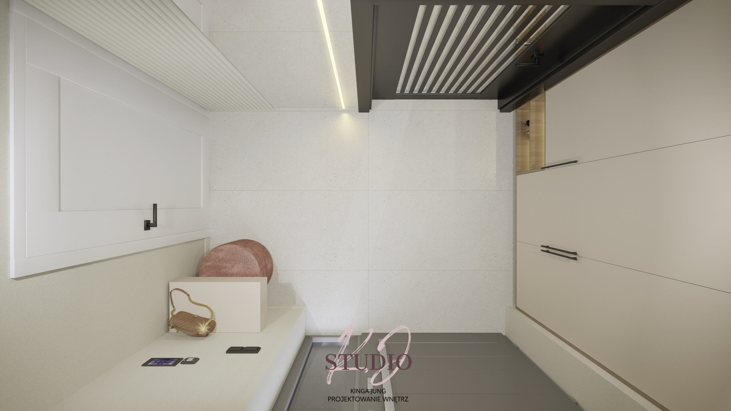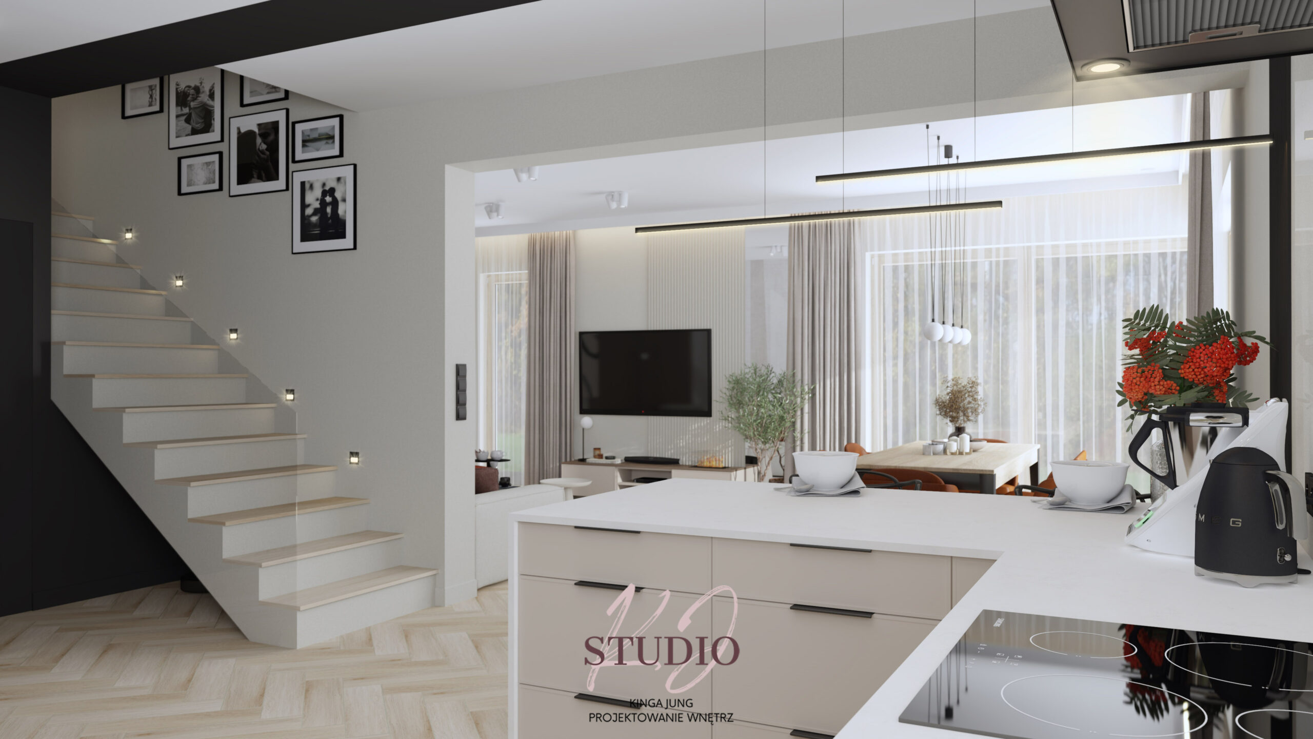 w ciepłej, beżowej tonacji. Kontrastu dodają czarne ażurowe drzwi prowadzące do części dziennej. Kuchnia zaprojektowana została w kształcie litery U. Zabudowa meblowa to połączenie jasnych frontów