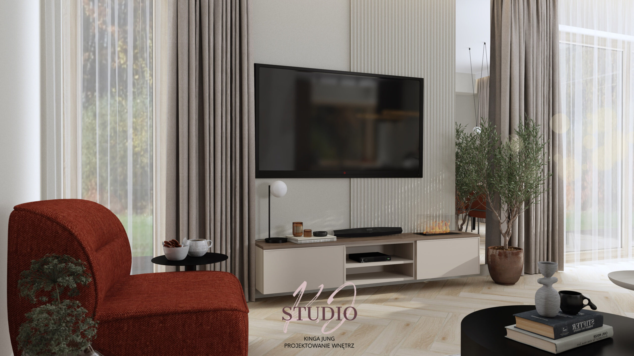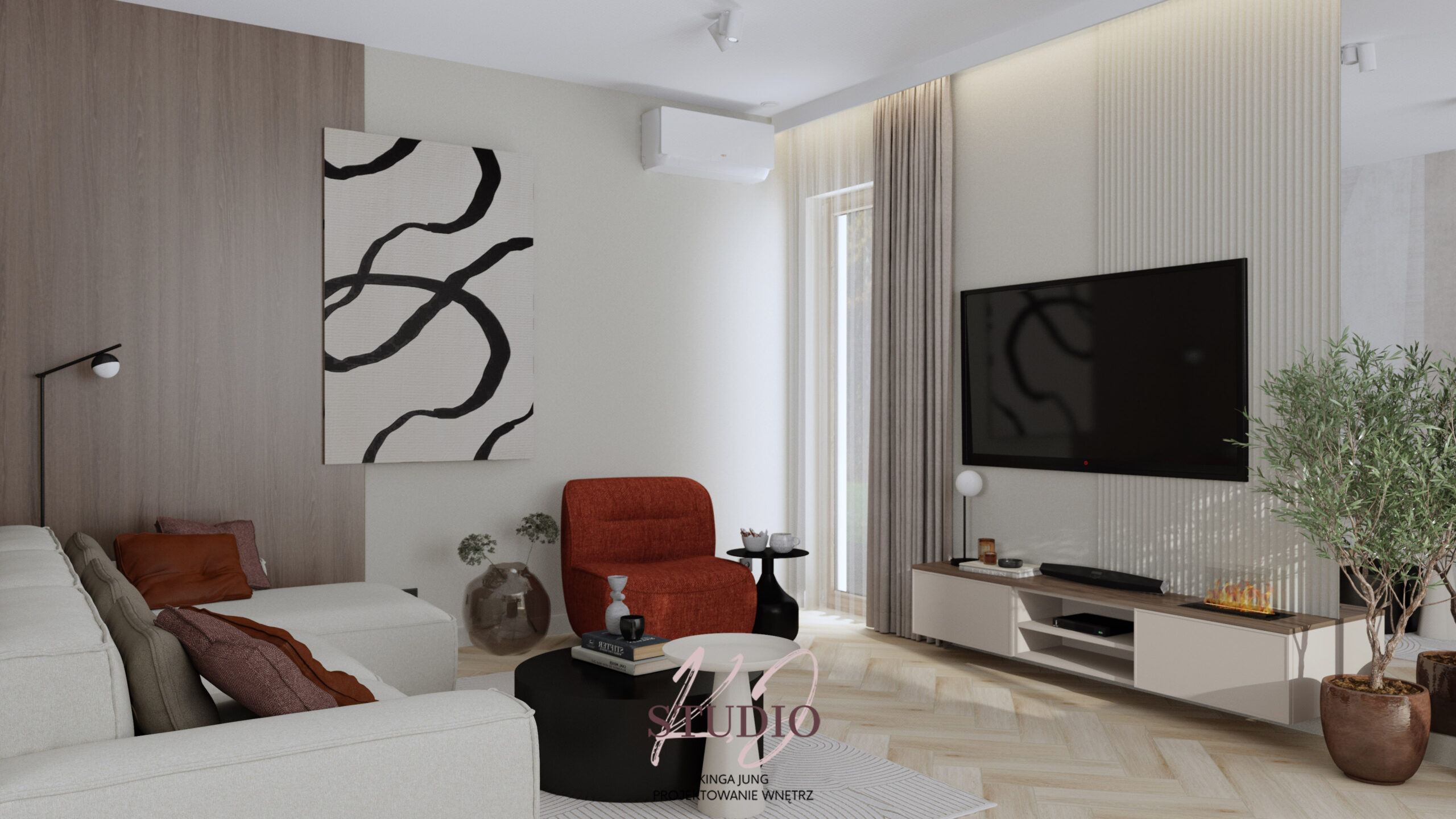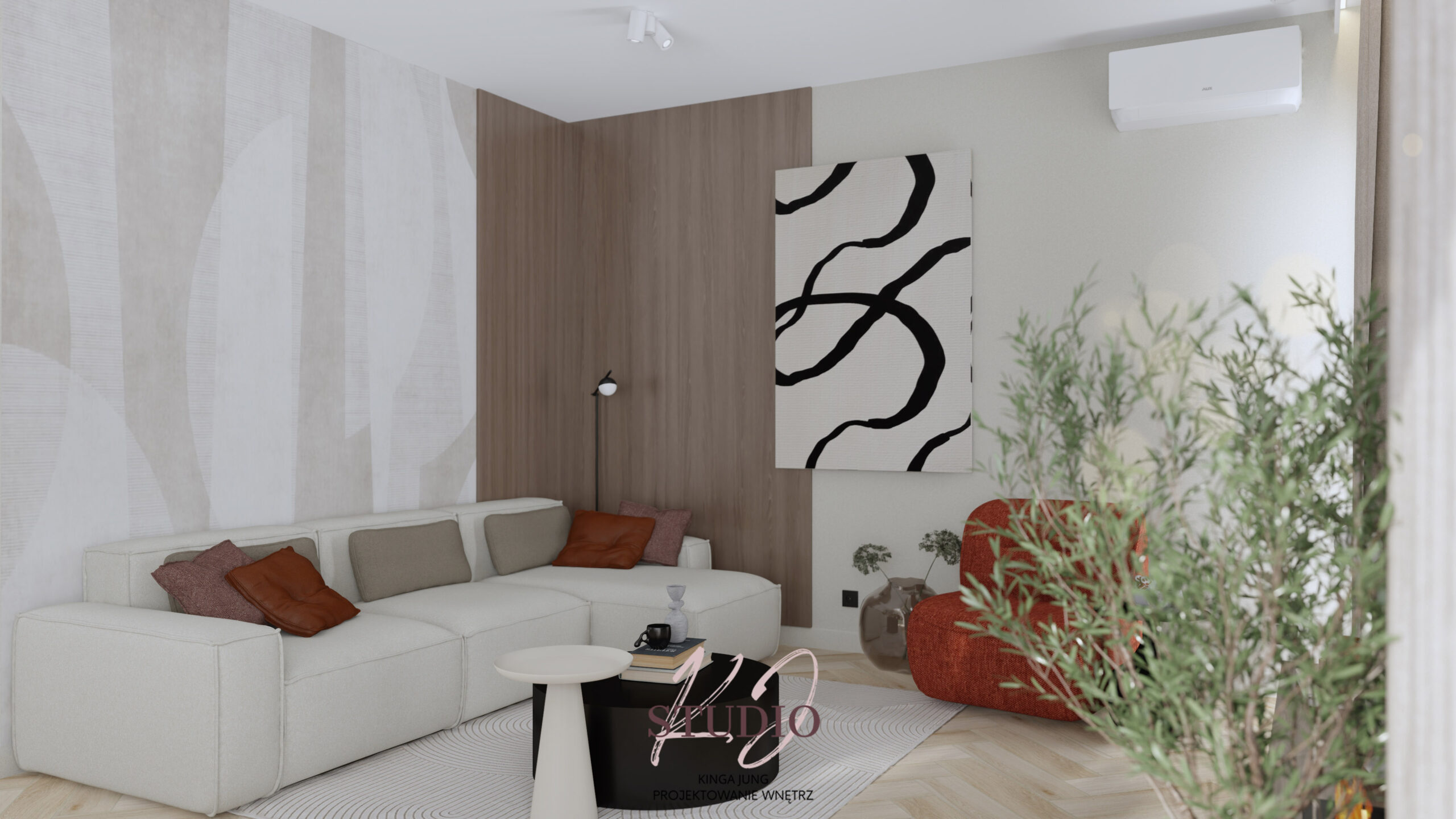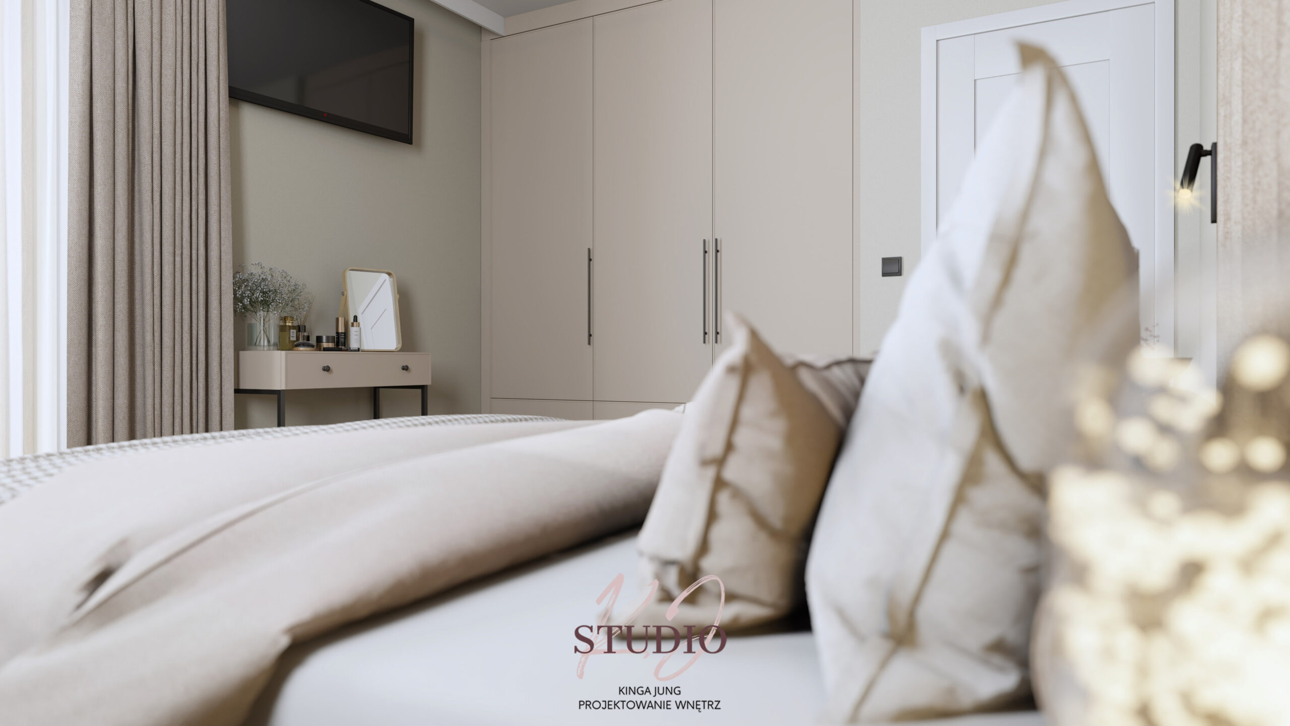 w ciepłej, beżowej tonacji. Kontrastu dodają czarne ażurowe drzwi prowadzące do części dziennej. Kuchnia zaprojektowana została w kształcie litery U. Zabudowa meblowa to połączenie jasnych frontów