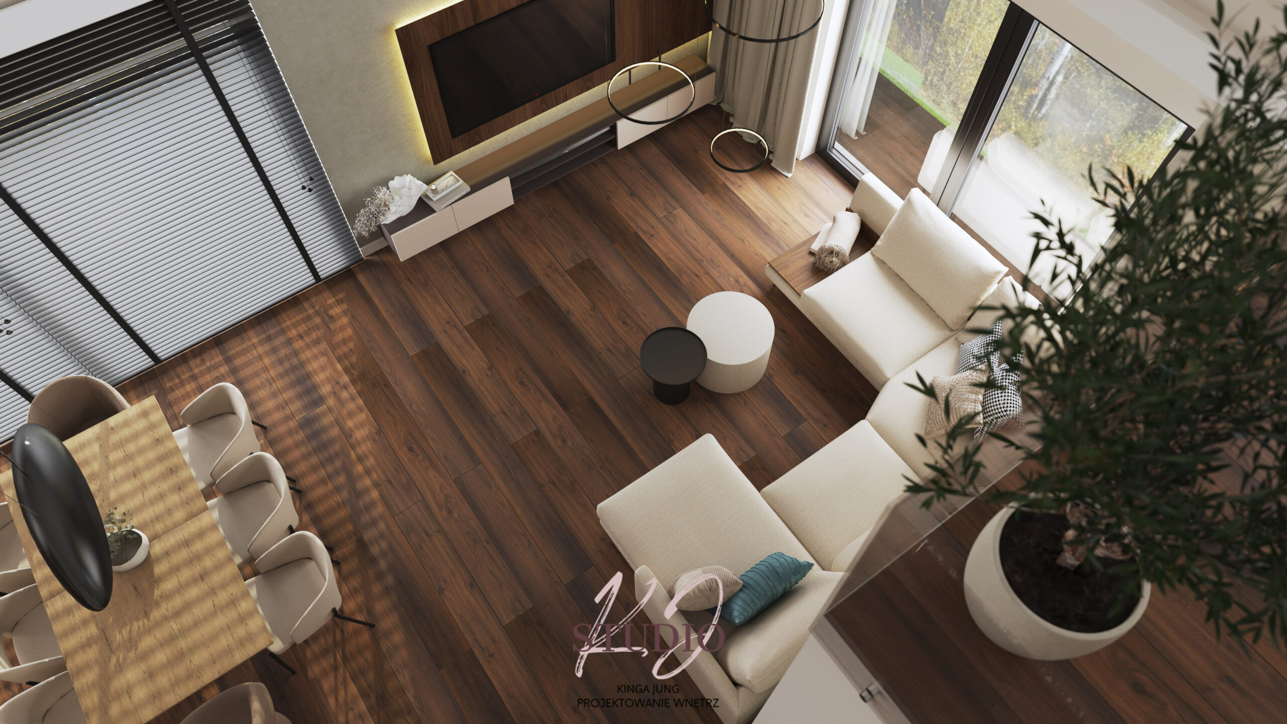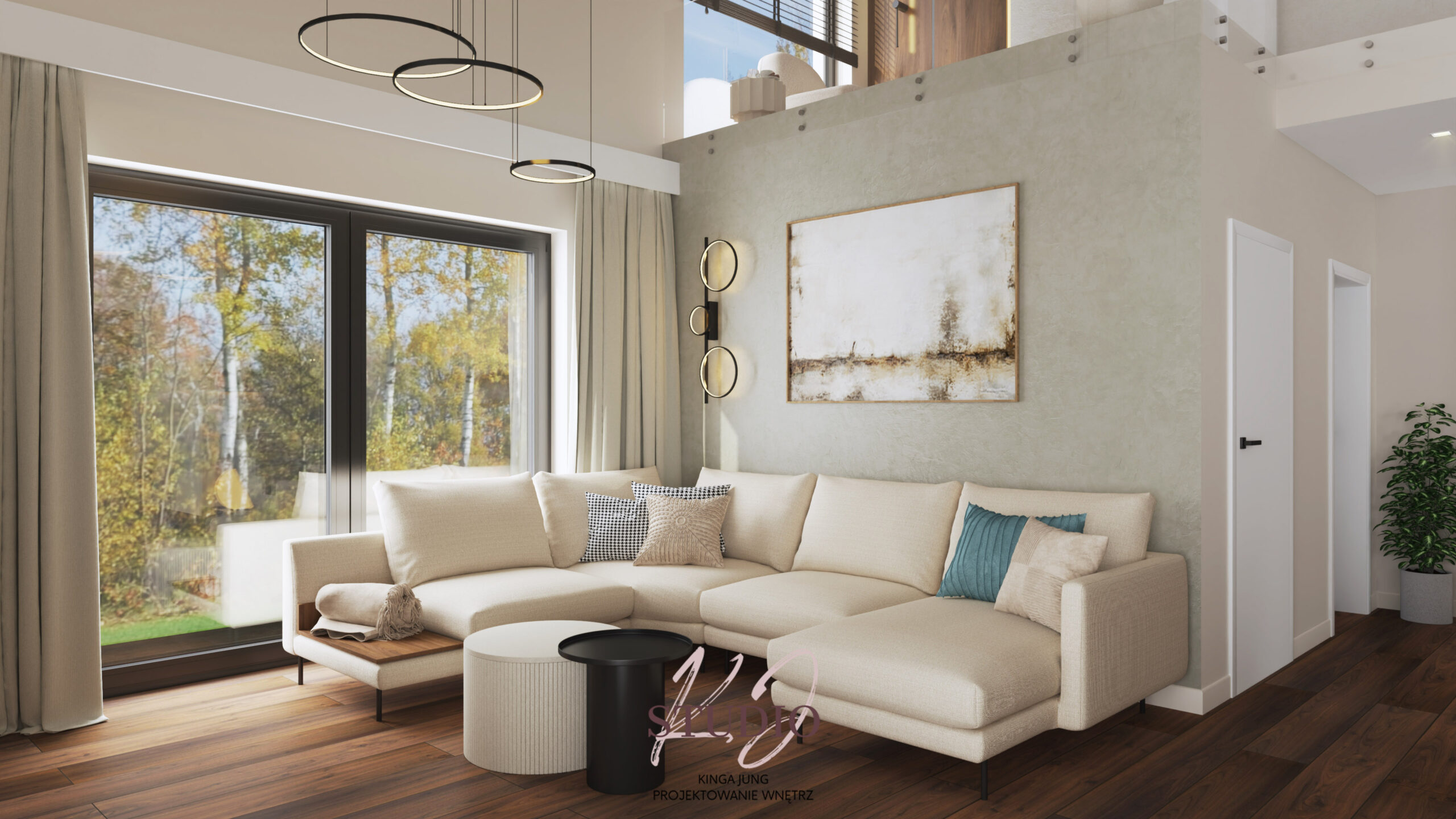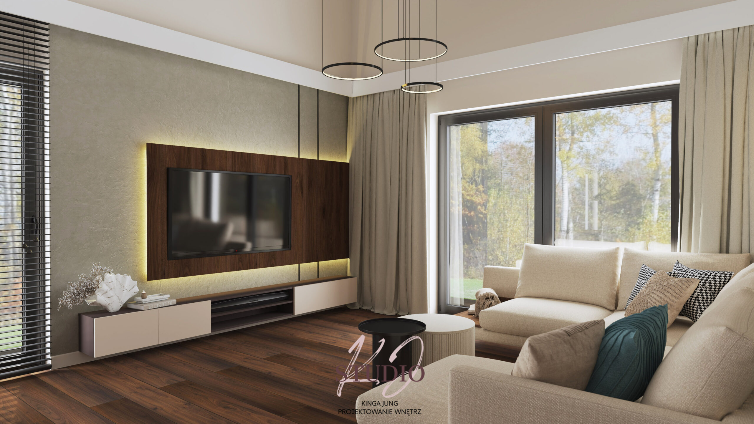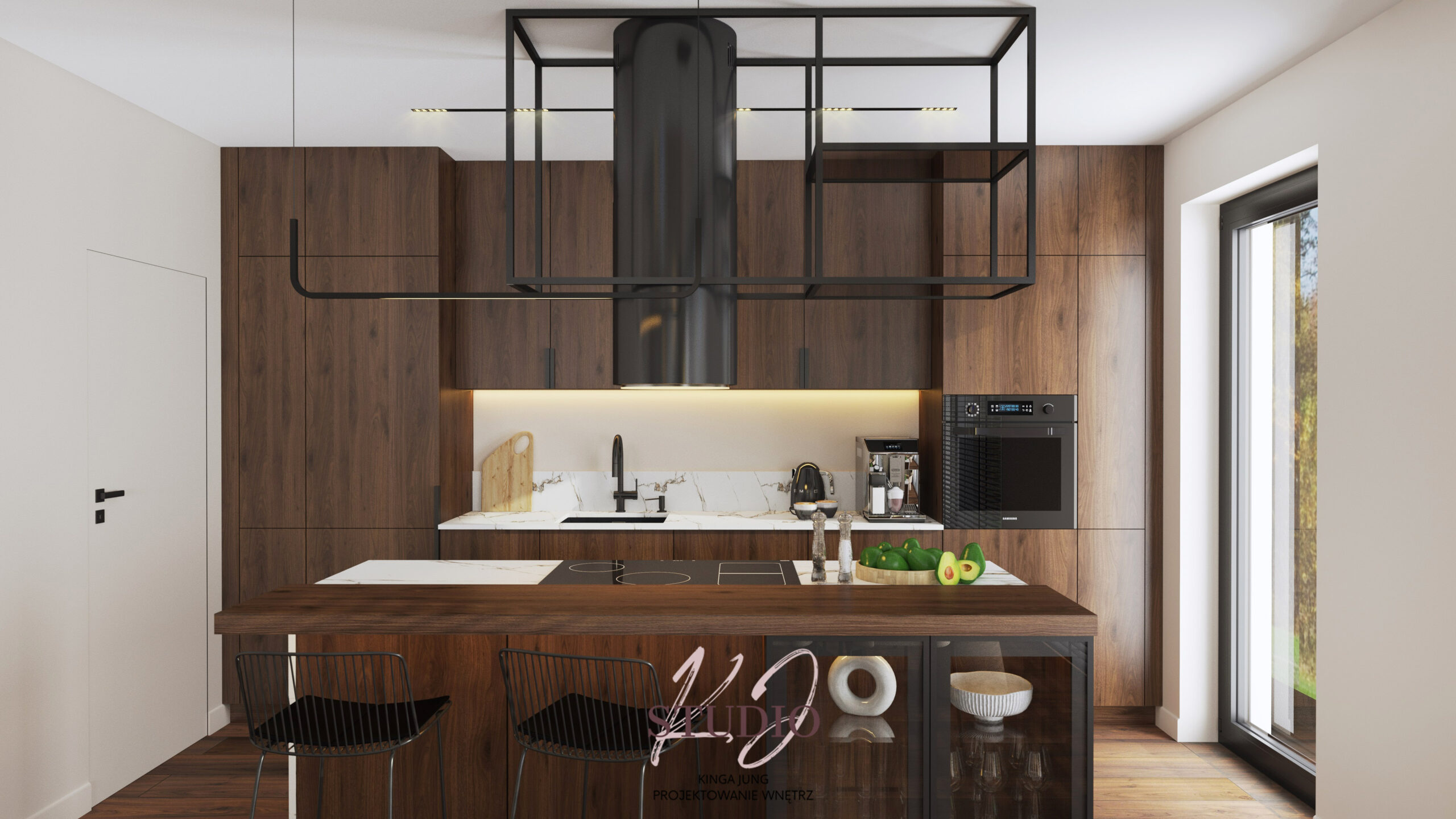 z wygodną półeczką. Dzięki modułowej formie, został on dopasowany do przestrzeni salonu. Po przeciwnej stronie znajduje się zabudowa TV z dekoracyjnym oświetleniem. Kuchnia to szafki z ciemnym drewnem oraz jasnym blatem. Zabudowa do sufitu pozwala