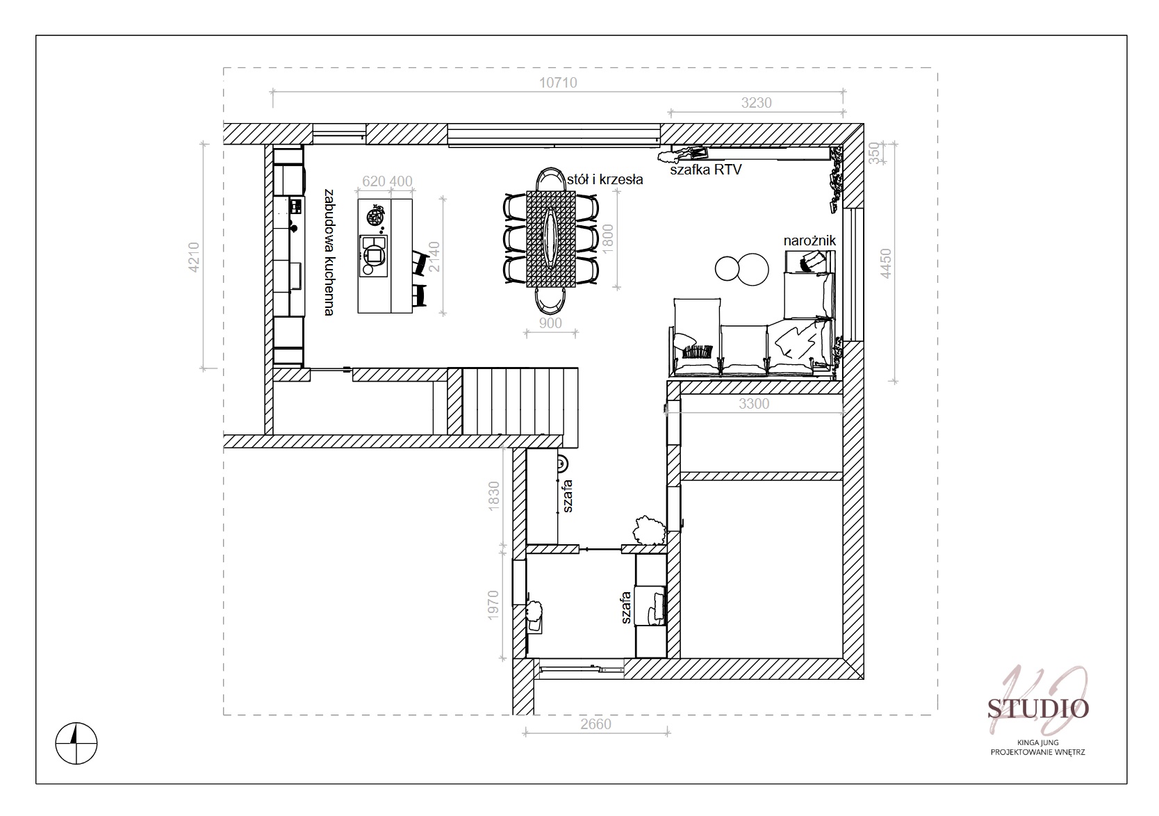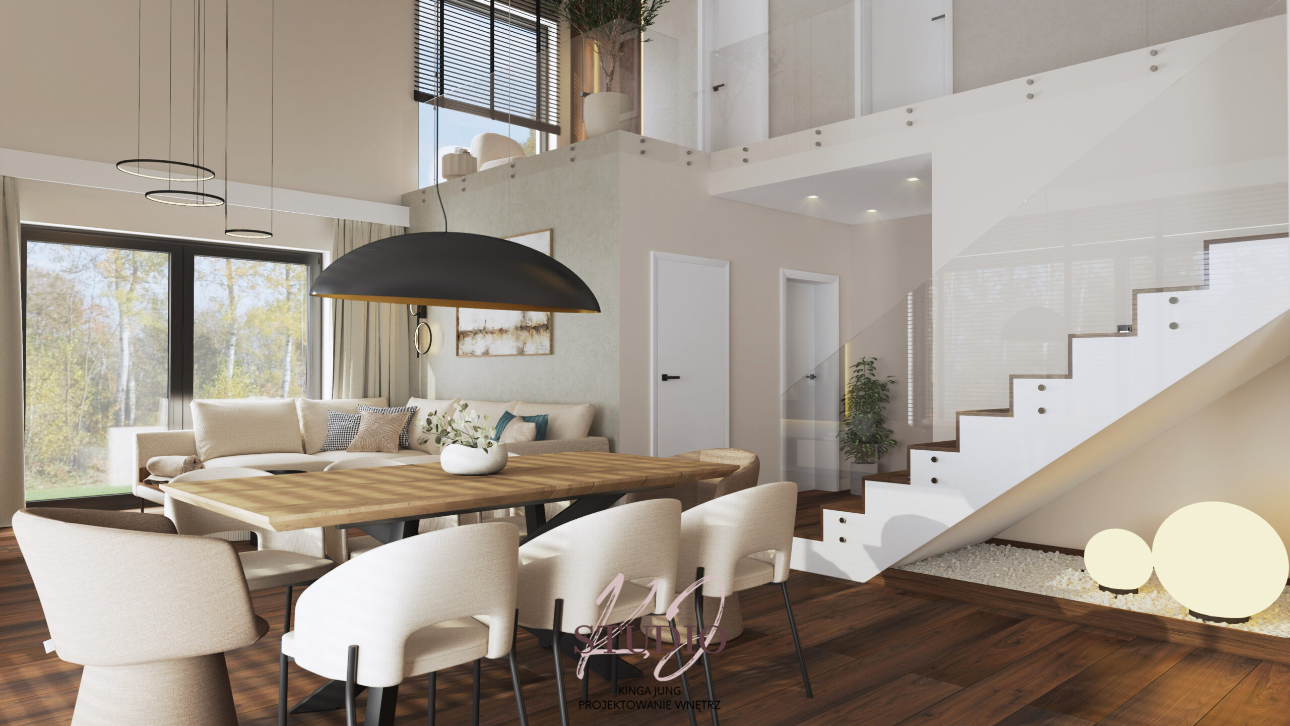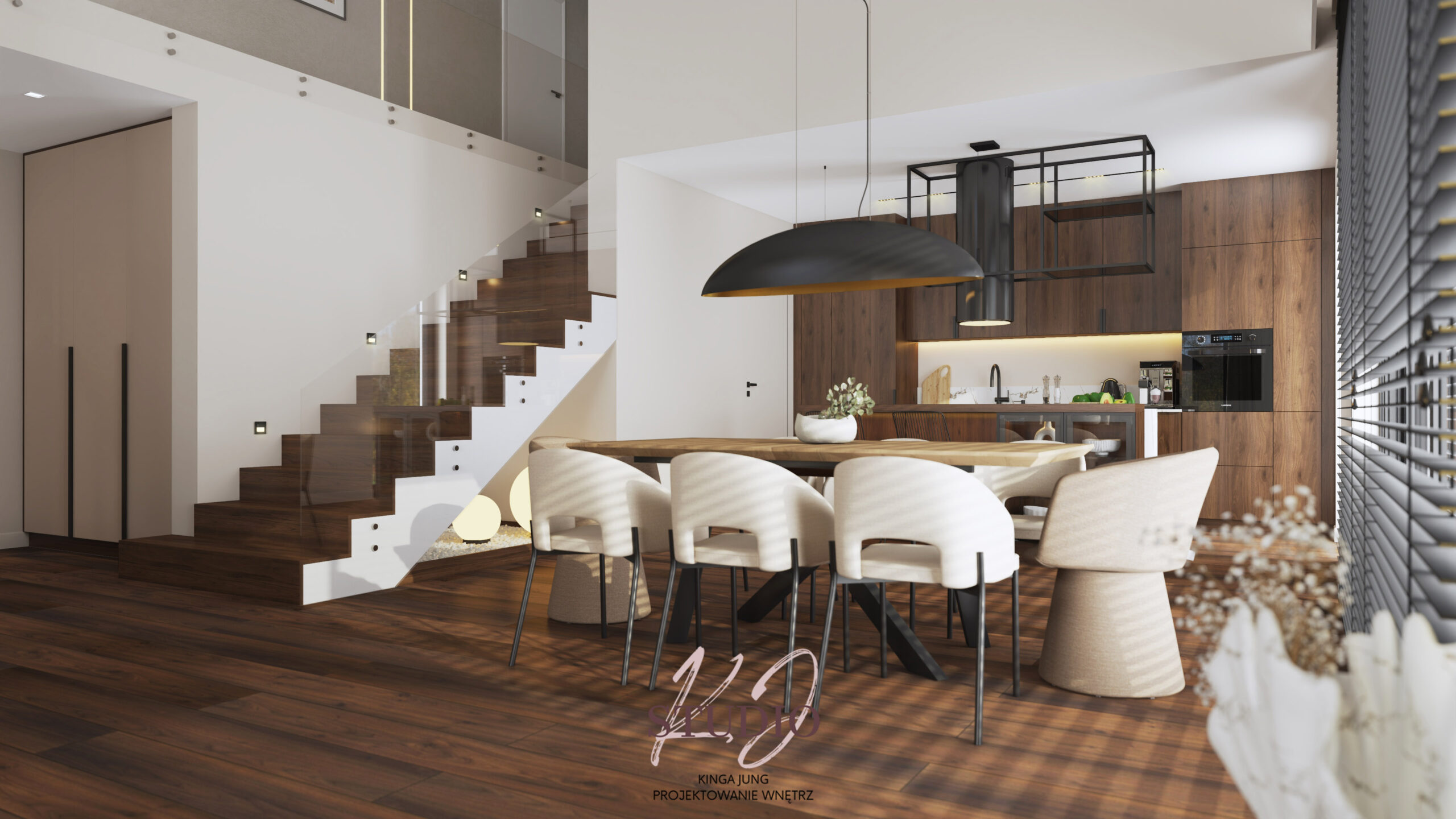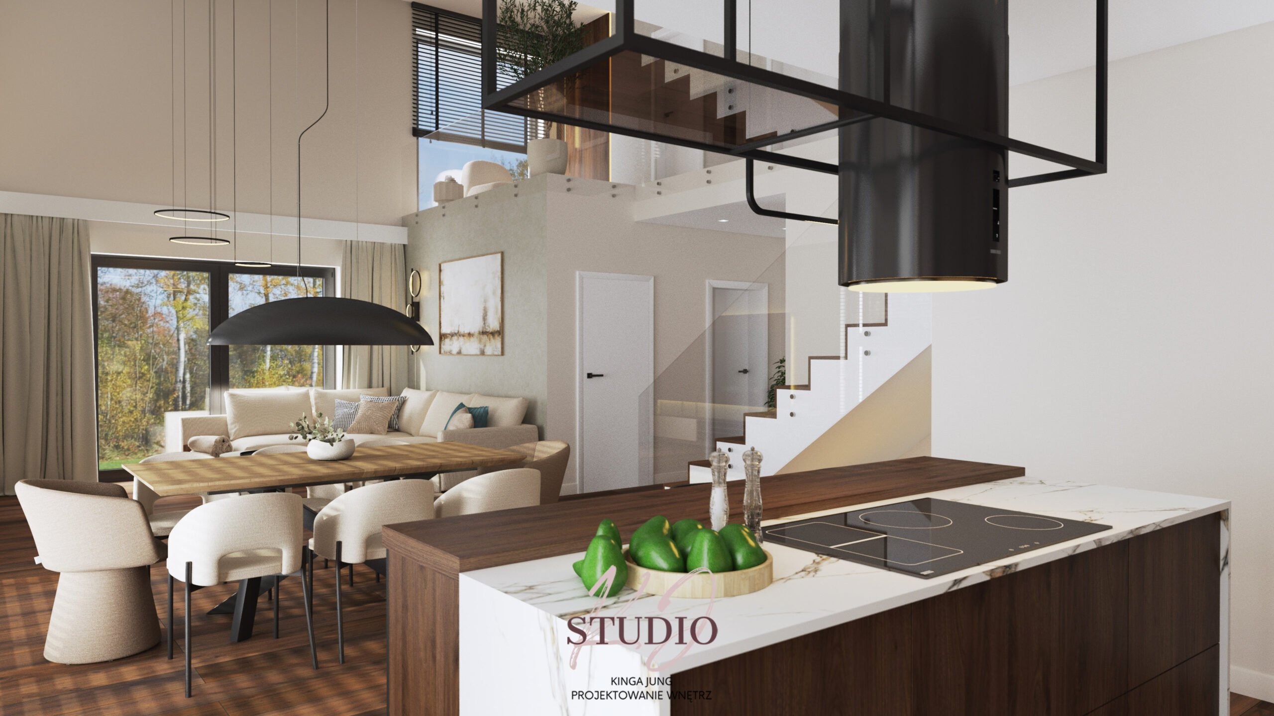 z wygodną półeczką. Dzięki modułowej formie, został on dopasowany do przestrzeni salonu. Po przeciwnej stronie znajduje się zabudowa TV z dekoracyjnym oświetleniem. Kuchnia to szafki z ciemnym drewnem oraz jasnym blatem. Zabudowa do sufitu pozwala