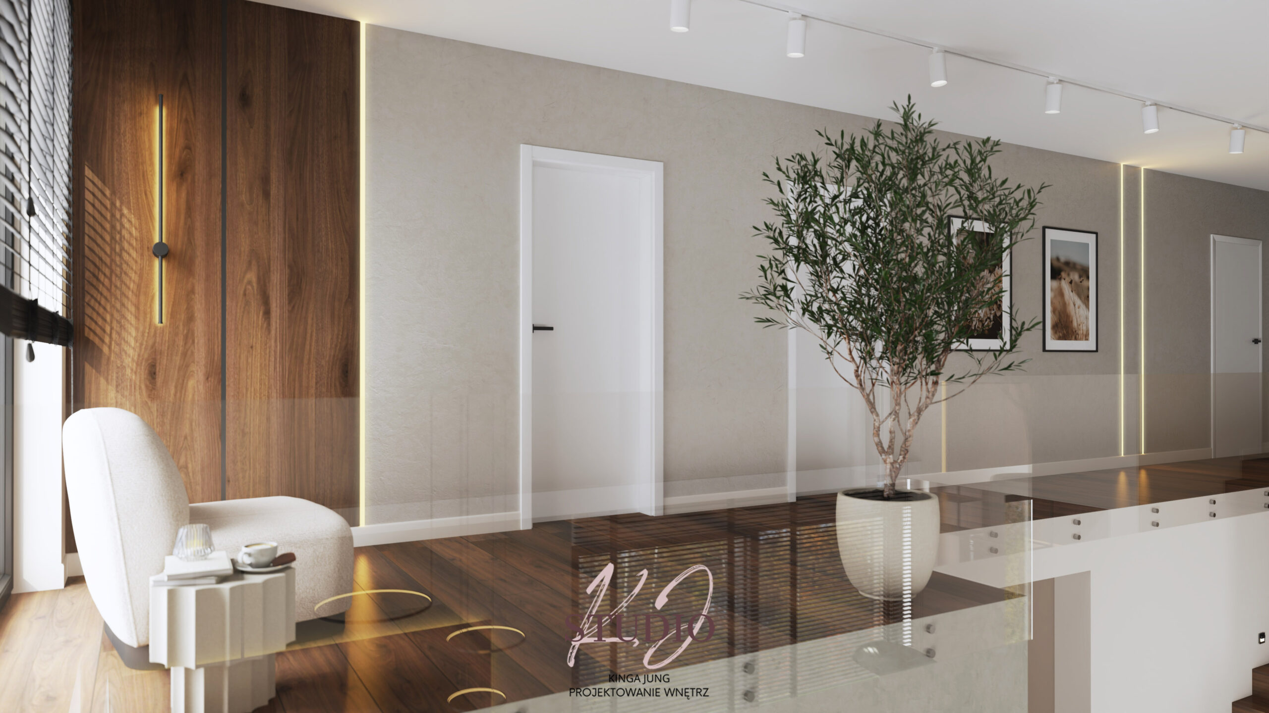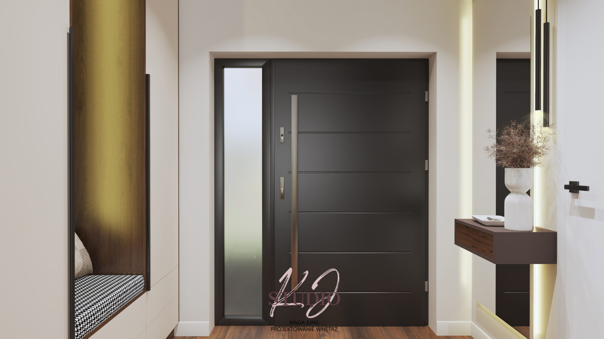 Strefa wejścia utrzymana jest w stylistyce modern classic podobnie jak cała dalsza przestrzeń domu.