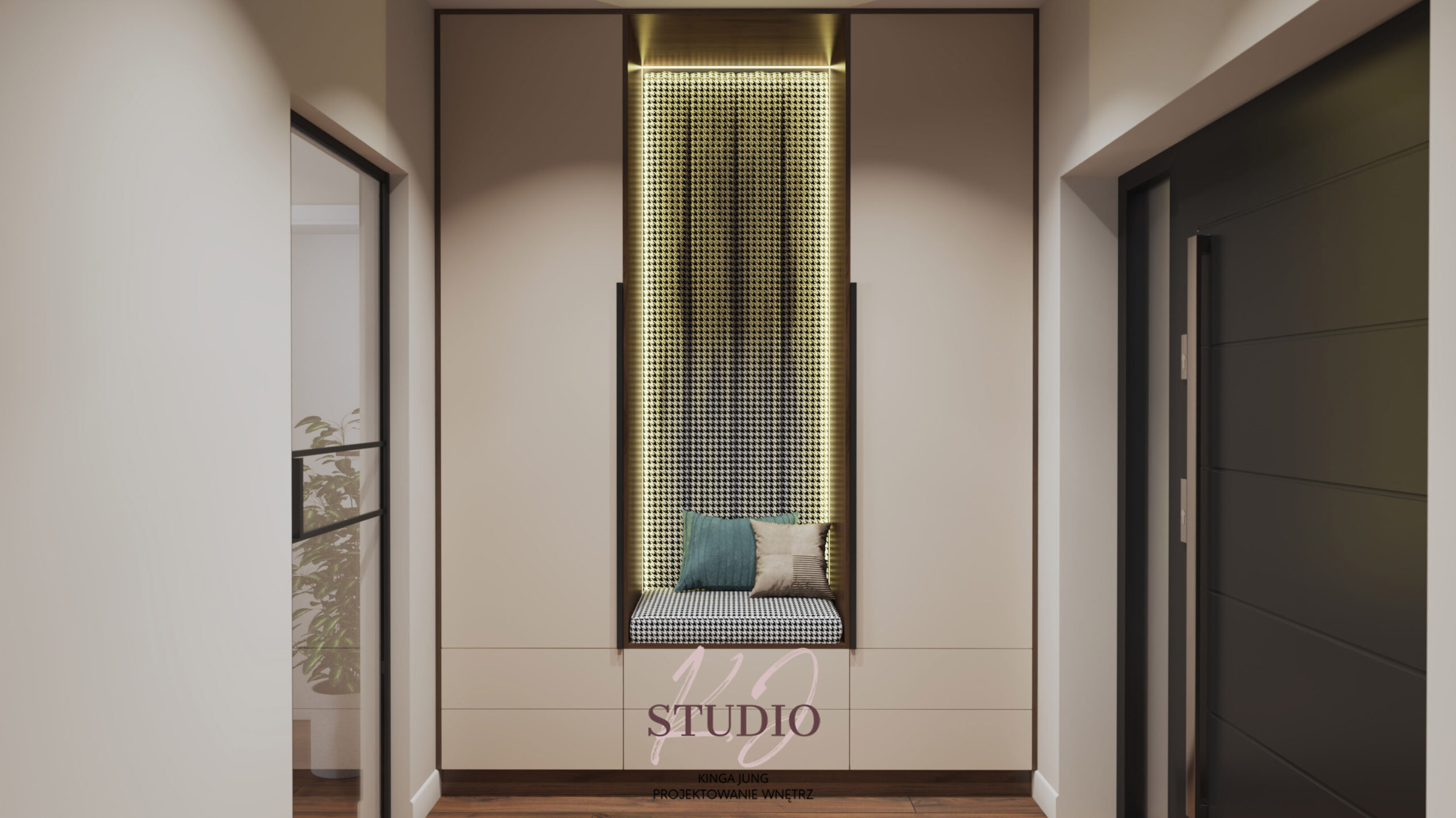 W wiatrołapie znajdziemy pojemną szafę z siedziskiem we wzór pepitki, duże lustro z podświetleniem