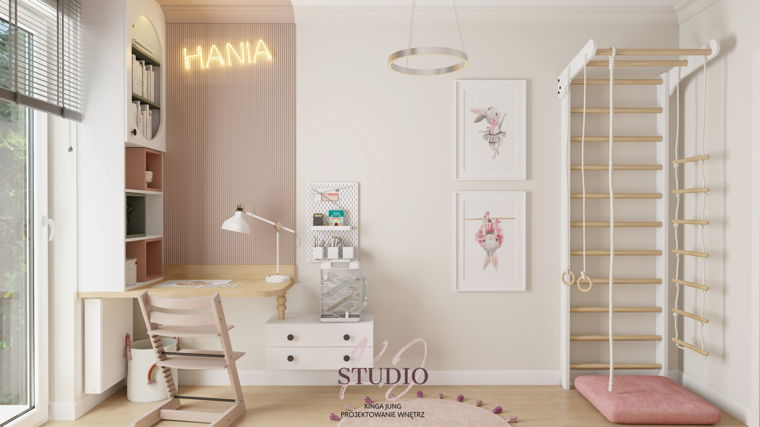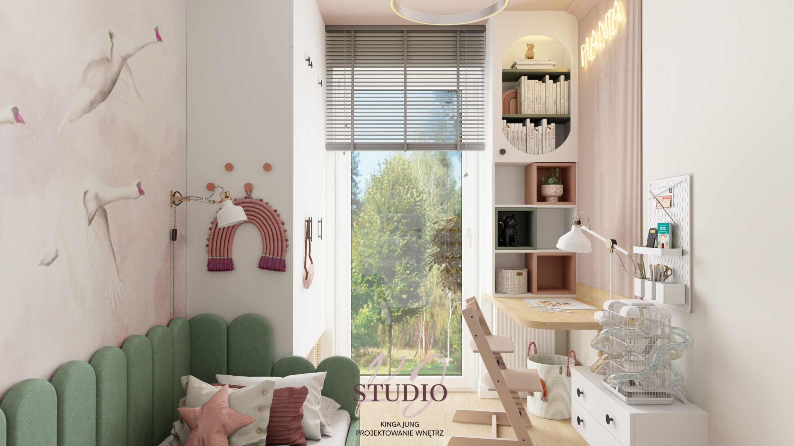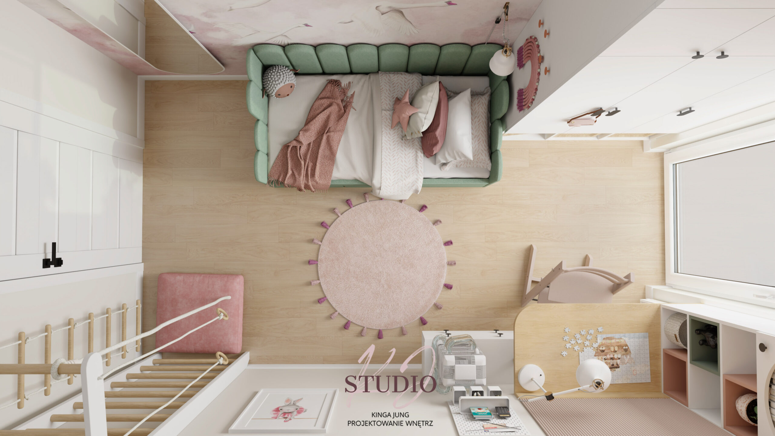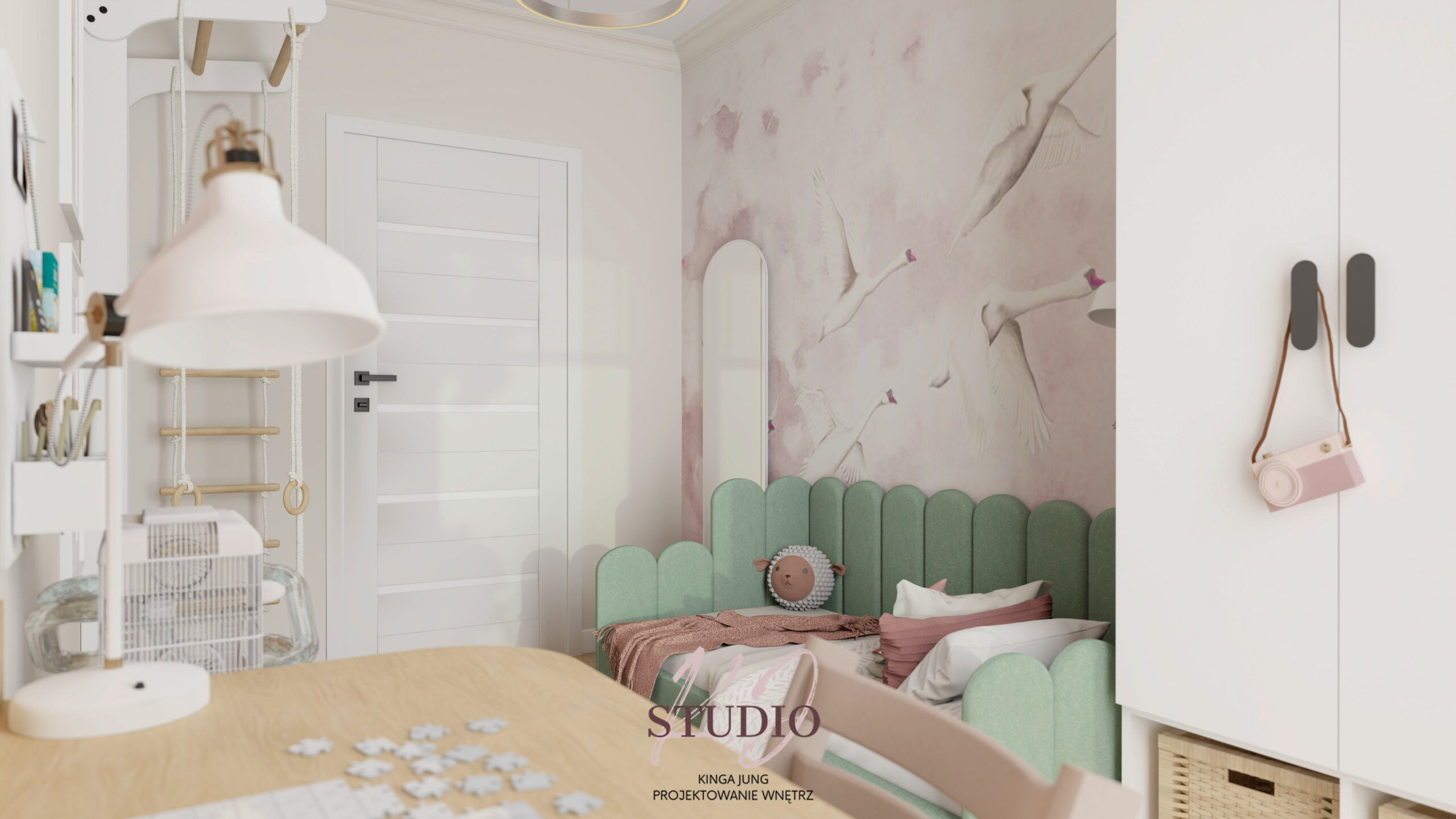 Projekt pokoju dziecięcego dla siedmiolatki, która uwielbia naturę, zwierzęta i taniec. W pokoju wydzielono miejsce