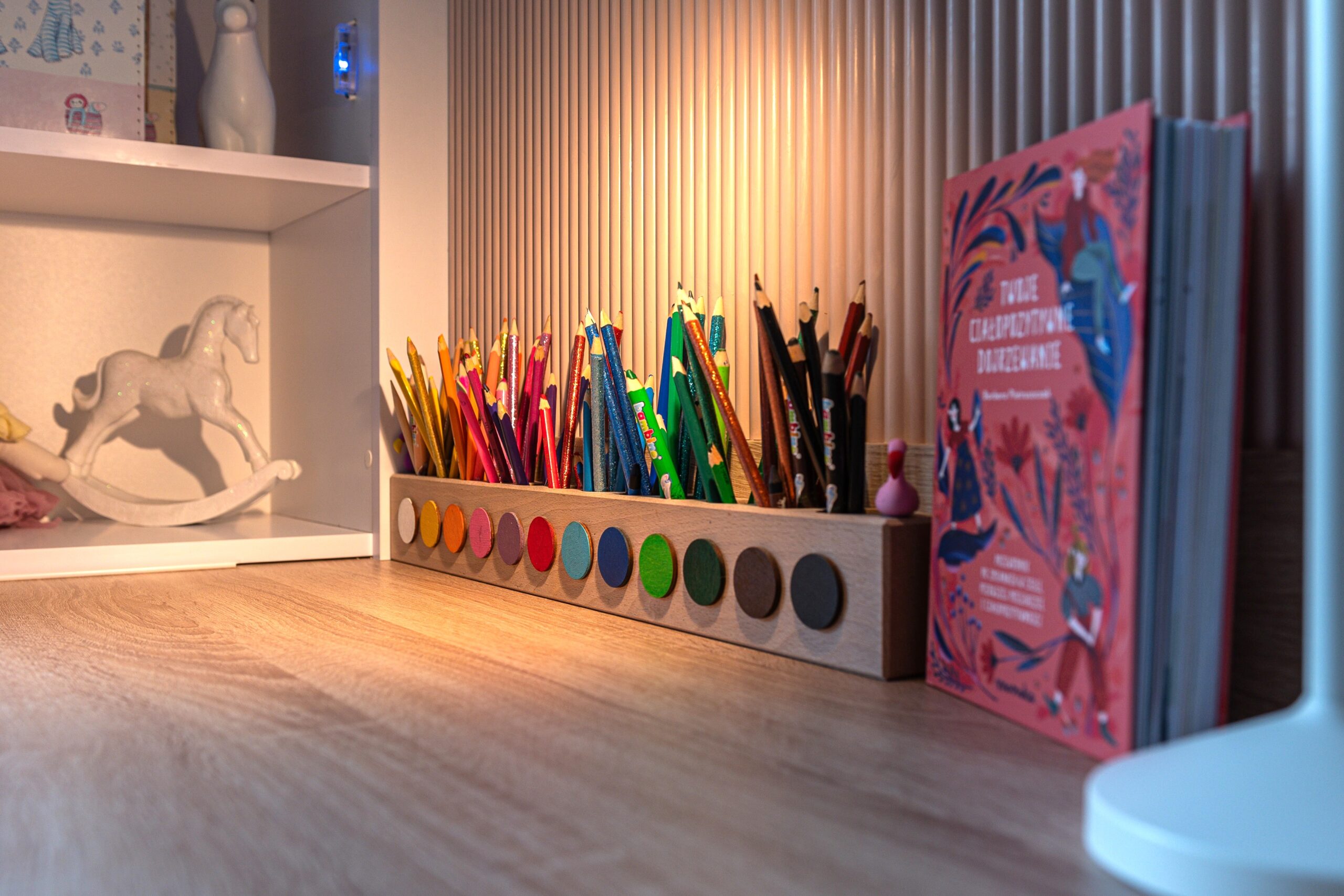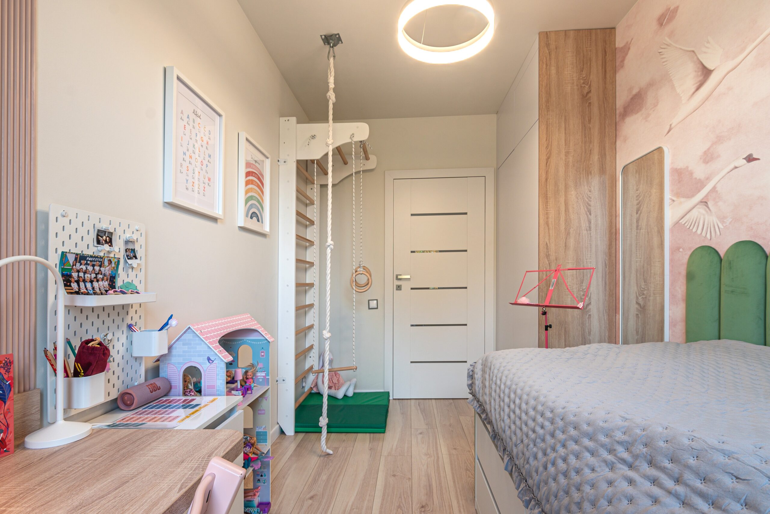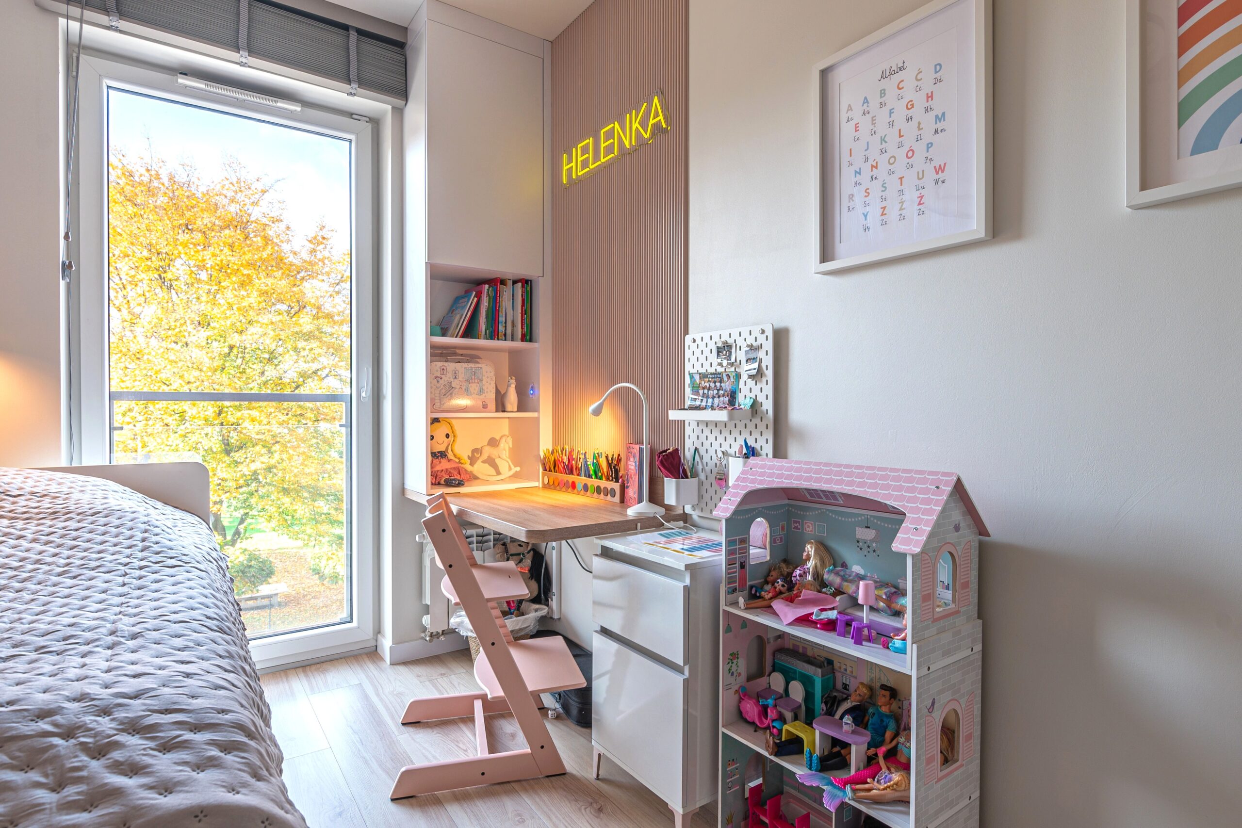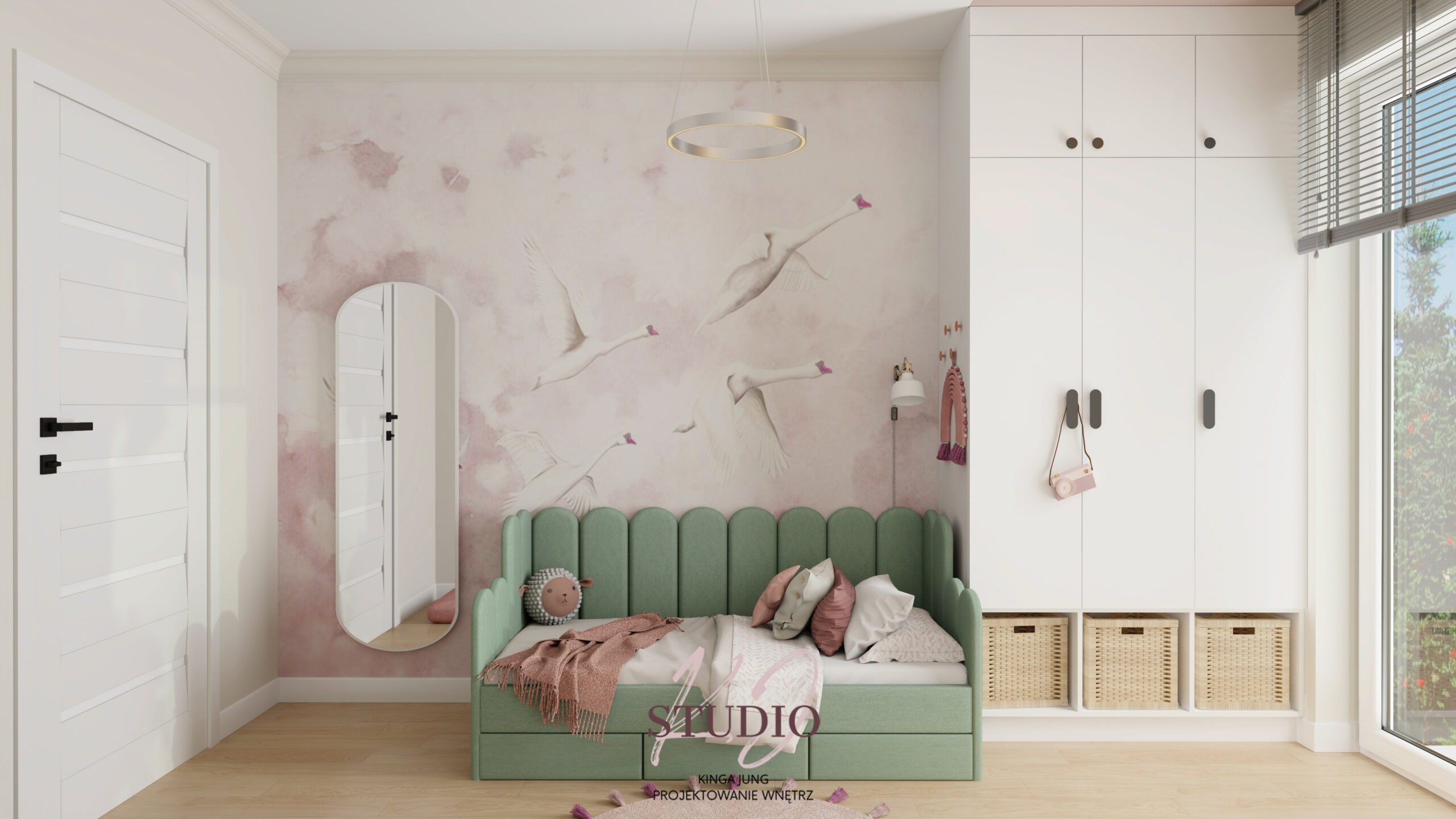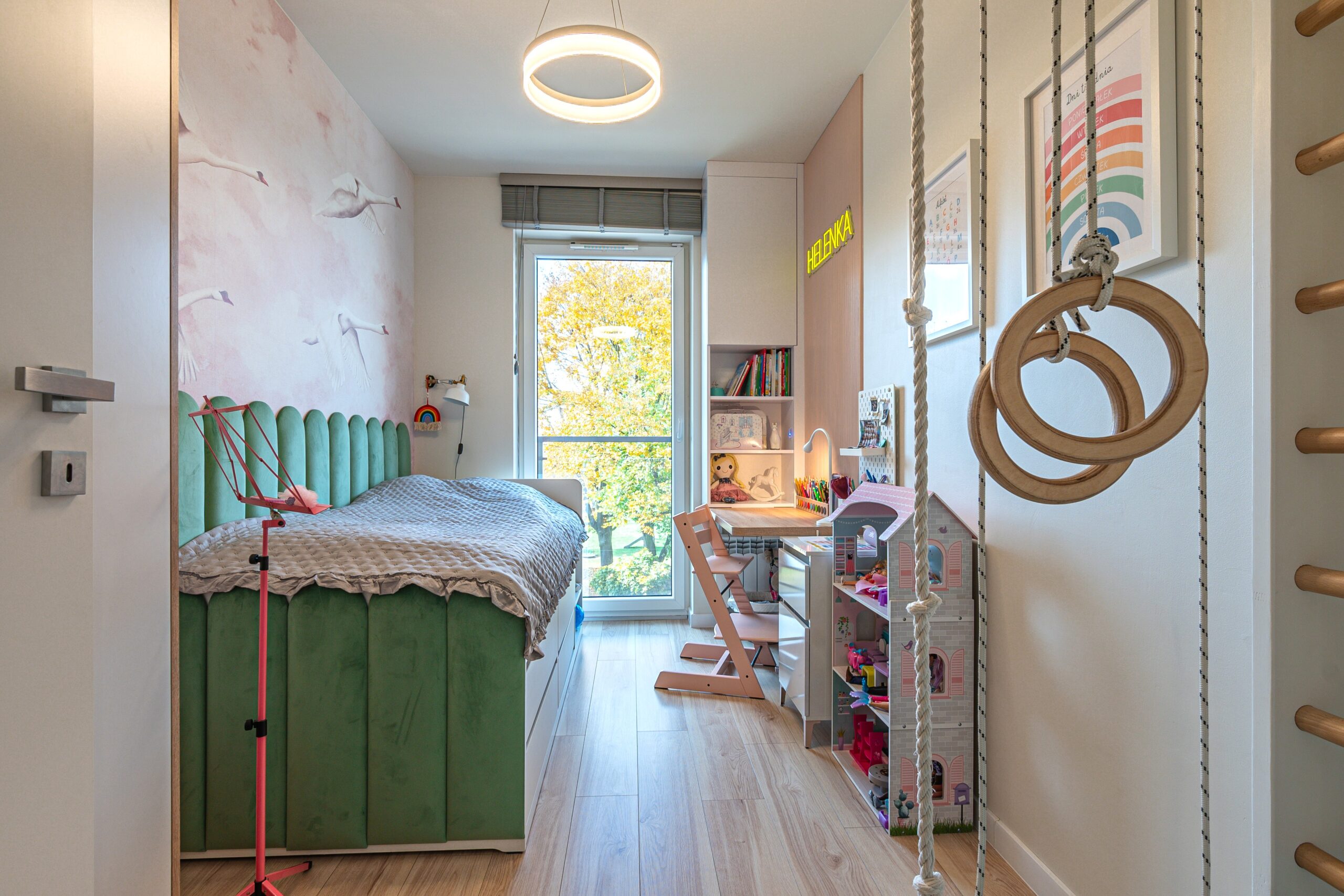 Projekt pokoju dziecięcego dla siedmiolatki, która uwielbia naturę, zwierzęta i taniec. W pokoju wydzielono miejsce